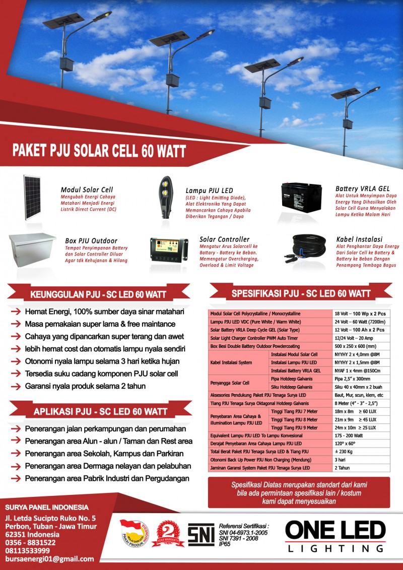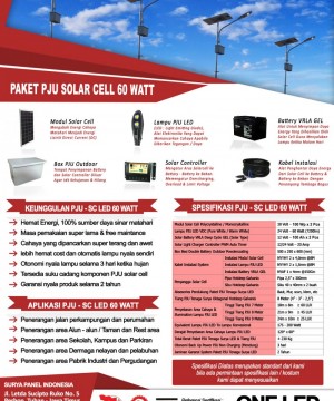 PAKET PJU SOLAR CELL 60 WATT LED merupakan sebuah alternatif yang pas karena dengan harga yg terjangkau dan hemat untuk digunakan sebagai sumber listrik penerangan. PAKET PJU SOLAR CELL 60 WATT LED sangat cocok di aplikasikan baik di Lampu Jalan, Lampu Taman, Lampu Penerangan Daerah Wisata, Lampu Dermaga, Lampu Lapangan Parkir, Lampu Jalan Raya Terpencil, Lampu Jalan Pedesaan, Lampu Lapangan Olah Raga, Lampu perkotaan, Dll yang jauh dari sumber energi listrik PLN maupun sumber-sumber listrik yang lain. Dengan menggunakan PAKET PJU SOLAR CELL 60 WATT LED ini, kita sudah memiliki Sumber Energi sendiri tanpa ketergantungan dengan pihak lain (MANDIRI), Dan pastinya hemat Biaya dan ramah lingkungan.