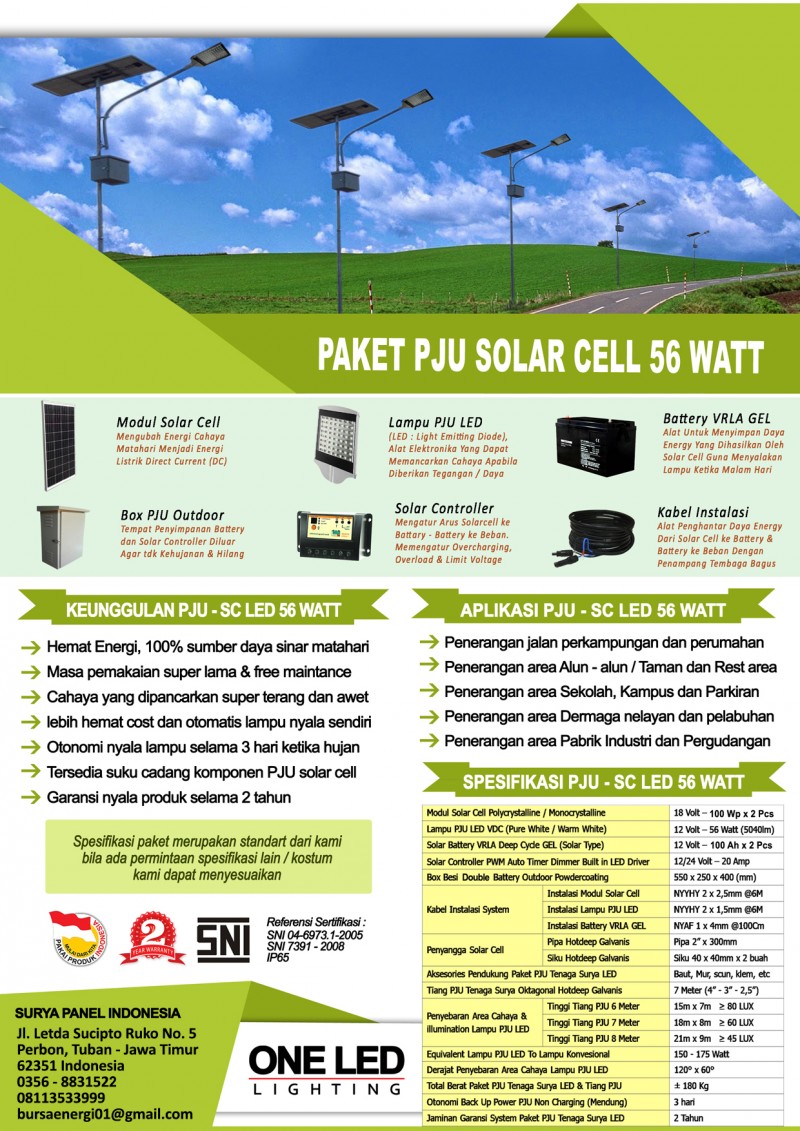 PAKET PJU SOLAR CELL 56 WATT LED merupakan sebuah alternatif yang pas karena dengan harga yg terjangkau dan hemat untuk digunakan sebagai sumber listrik penerangan. PAKET PJU SOLAR CELL 56 WATT LED sangat cocok di aplikasikan baik di Lampu Jalan perkotaan, Lampu Taman, Lampu Penerangan Daerah Wisata, Lampu Dermaga, Lampu Lapangan Parkir, Lampu Jalan Raya Terpencil, Lampu Jalan Pedesaan, Lampu Lapangan Olah Raga, Dll yang jauh dari sumber energi listrik PLN maupun sumber-sumber listrik yang lain. Dengan menggunakan PAKET PJU SOLAR CELL 56 WATT LED ini, kita sudah memiliki Sumber Energi sendiri tanpa ketergantungan dengan pihak lain (MANDIRI), Dan pastinya hemat Biaya dan ramah lingkungan.